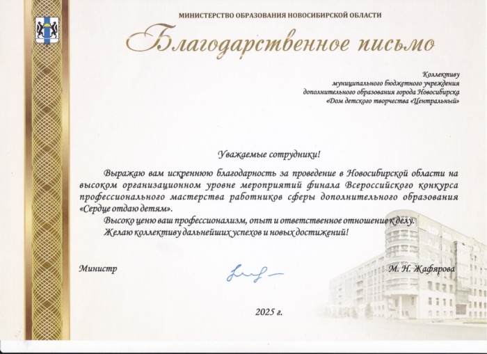 Коллектив Дома детского творчества «Центральный» отмечен высокой наградой Министерства образования Новосибирской области! Эта почётная награда присуждена за высокий организационный уровень мероприятий финала Всероссийского конкурса профессионального мастерства работников сферы дополнительного образования «Сердце отдаю детям».