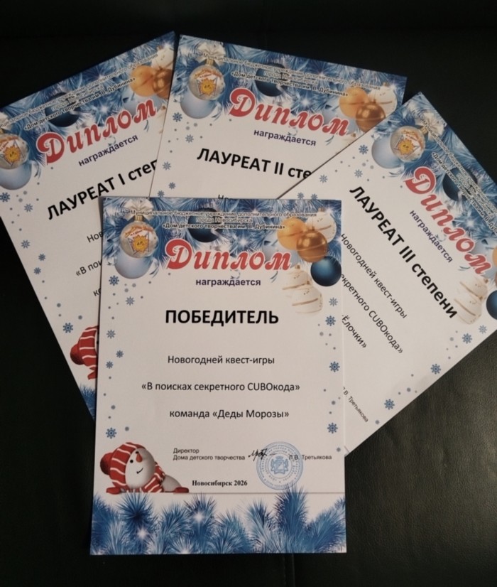 Но в любой игре есть победители и проигравшие. Звание абсолютных победителей новогодней квест-игры «В поисках секретного CUBOкода» завоевала команда «Деды Морозы», в составе которой играли Гасенко Алёна и Рязанов Кирилл. Лауреатами 1 степени стала команда «Снегурочки и снегурята», в состав данной команды входили Маринина София, Банников Максим и Агарков Платон, лауреатами 2 степени стала команда «Подарочки», в этой команде секретный CUBOкод искала Ананьина Софья и лауреатами 3 степени стала команда в состав которой входил Шонгин Александр.