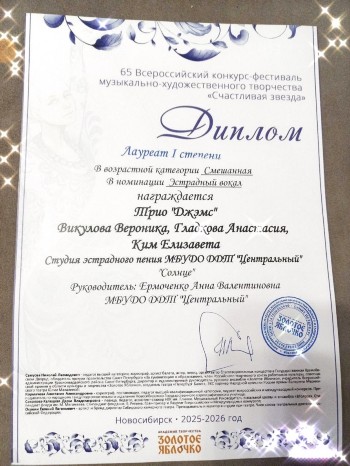 Наше блестящее вокальное трио «Джем» под руководством педагога Анны Валентиновны Ермоченко отлично выступило на всероссийском конкурсе «Счастливая звезда». Юные вокалистки - Вероника Викулова, Гладкова Анастасия, Елизавета Ким- взяли диплом лауреата 1 степени! Это победа, которая точно заслуживает бурных аплодисментов!