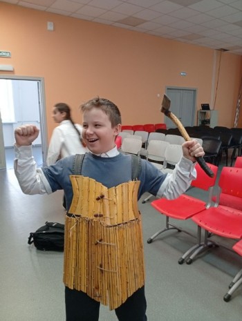 Особый интерес вызвала возможность примерить макет доспеха воина, жившего три с половиной тысячи лет тому назад. Пусть этот макет выполнен из дерева, но выглядит он как настоящий. А если взять в руку макет топорика-кельта , то можно представить себя древним витязем готовым ринуться в бой на защиту родного племени.
