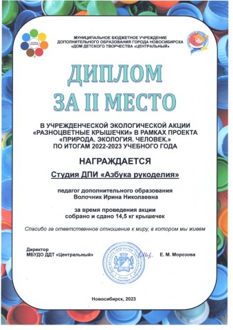 В Доме детского творчества «Центральный» с ноября 2022 года по май 2023 года среди обучающихся ДДТ «Центральный» проводилась экологическая акция «Разноцветные крышечки» в рамках проекта «Природа. Экология. Человек» и акции «Разноцветные крышечки» проекта «Разделяй и сохраняй» при поддержке министерства образования Новосибирской области. Акция «Разноцветные крышечки» имеет двойную цель: сделать наш мир чище и помочь детям, которым нужна поддержка.