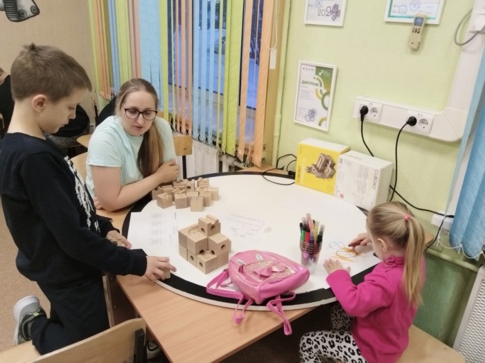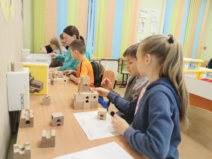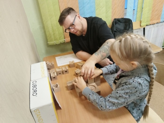 26 декабря в группе №21, обучающихся по программе «Cuboro: игра и спорт юных инженеров», прошло открытое занятие с участием родителей, где взрослые выполняли роль детей, а дети – роль взрослых. Родителям предстояло построить дорожки из кубиков Cuboro, прочитать сложные технические рисунки конструкций, определить кубики по номерам и даже придумать своё решение задачи! В это время ребята были младшими помощниками педагога, подсказывали взрослым и старались научить их тому, что умеют сами.