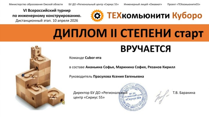 Обучающиеся кружка конструирования «CUBORёнОк-РОБОТИШКА» под руководством своего педагога Прасуловой Ксении Евгеньевны выступали во всех трёх возрастных категориях. Две команды представляли дошкольный возраст, две команды – младший школьный и одна команда – средний школьный возраст.