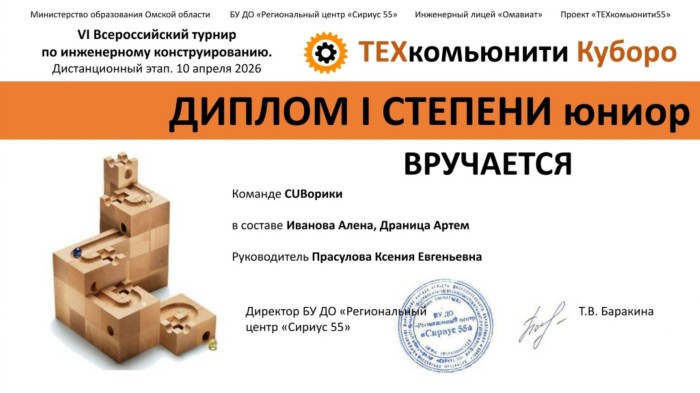 Иванова Алёна и Драница Артём стали золотыми призёрами в своей возрастной категории (Junior), разделив ступень пьедестала со своими CUBORO-друзьями из Дома детского творчества имени Володи Дубинина, г. Новосибирск.