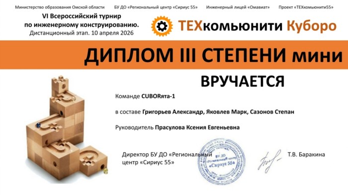 В номинации Mini (ДОУ) команда в составе Григорьев Александр, Яковлев Марк, Сазонов Степан стали бронзовыми призёрами турнира.