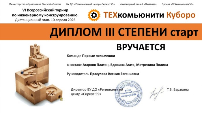 Агарков Платон, Вдовина Агата и Матренина Полина стали бронзовыми призёрами в той же возрастной категории, разделив ступень пьедестала с командой из Ноябрьска и командой из Усть-Илимска.